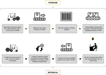 Automatic Storage and Retrieval Systems (ASRS) can play a vital role in improving material flow and increasing production performance in any textile factory, be it for weaving, knitting, processing or garmenting. An optimum material handling system reduces the material transportation time, and ensures that the required materials are transferred to the point of use safely, without any error or damage. In a sewing department, for instance, a material handling system may be customised based on the line layout, better ensuring smooth movement of fabric rolls from one workstation to another, or for storing or cutting.