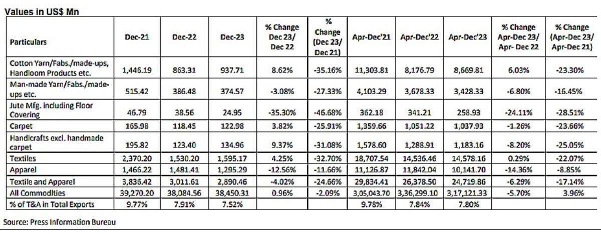 During Dec 23, Indian Textiles Exports registered a growth of 4.25% over the previous year while Apparel Exports registered a degrowth of -12.56% during the same time period. However, as compared to Dec 21, exports of both Textile and Apparel have declined by -32.70% and -11.66% respectively.