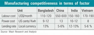 The power cost in India is higher than that in Bangladesh and Vietnam. There are erratic and limited supplies in some parts of India and Bangladesh, Vietnam enjoys a lower cost than India and consistent supplies. China has the highest power cost, but its supplies are consistent and reliable. The lending rates in India – 11 per cent to 12.5 per cent are very high than those in China and Vietnam while it is comparable to those in Bangladesh. High lending rates affect the cost of production and hence its competitiveness.