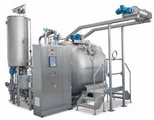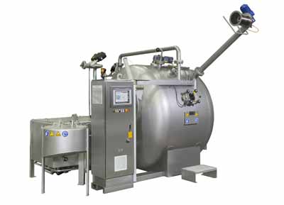 The TEMPACTA washing steamer has been especially developed for all low-tension washing processes and is mainly used for diffusion washing (fastness washing). The unit has a consistent counterflow water supply. Online measurement of the degree of contamination regulates the necessary amount of fresh water in order to a.) Guarantee the lowest possible water and energy consumption and b.) Ensure a high reproducibility of the washing result.