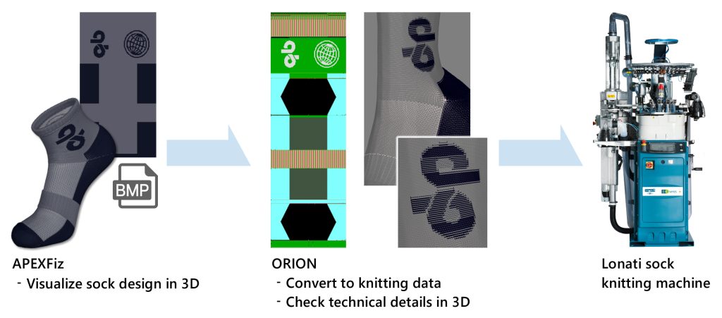 By combining SHIMA SEIKI’s APEXFiz® Design-Sox software which features dedicated 3D virtual sampling capability for socks, together with Lonati’s ORION programming software which allows users to proactively verify data in 3D from a technical perspective, potential issues can be identified and resolved in advance at each stage from programming to manufacturing. This integration enables companies to shorten time-to-market while efficiently delivering high-quality products. Furthermore, utilizing 3D virtual sampling significantly reduces the need for physical samples, thereby minimizing material waste and environmental impact caused by disposal of unnecessary samples, contributing to sustainable manufacturing.