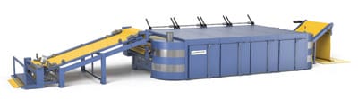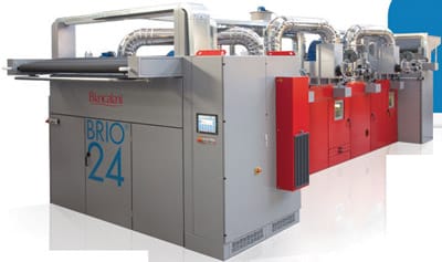 The current configuration of BRIO 24 foresees the passage of the material between the consecutive double-tank modules for the continuous treatment of the natural or blended knit fabric, mixed with viscose or other synthetic and artificial fibres. The article enters from one side of the machine and leaves the other side dry, soft and dense. The process consists the passage of knitted fabric through the tanks subjected to an intense high frequency vibration, inside which the knit dries, shrinks, obtains the maximum possible contraction for each type of texture and composition.