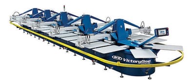 VICTORYONE® Automatic Oval Screen Printing Press M&R’s aggressively-priced VictoryOne is the industry’s most affordable oval screen printing press—and it can be paired with two different M&R Digital Squeegees for fast hybrid printing. VictoryOne’s 22-station base module can be expanded in 6- station increments to create 28, 34, 40, 46, 52, 58, and 64-station configurations. All but the four stations at each end of the press can support printheads, which must be configured in opposing pairs. Otherwise, there are no restrictions on printhead placement, and any station can be left open. VictoryOne’s flexibility allows it to be tailored to almost any production requirement. It also allows VictoryOne to fit into spots no carousel press could.