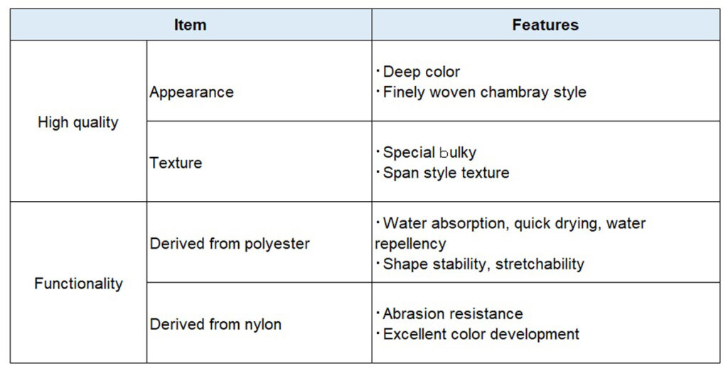 The raw yarn has a gently V-shaped highly-deformed cross-section, which provides bulkiness and a spun-like, soft texture. Uniformly mixing polyester and nylon on the surface and in the structure of the woven fabric produces a combination of desirable features from both materials, such as the abrasion resistance and color development capabilities of nylon, and the water absorption, quick-drying properties and shape stability of polyester.