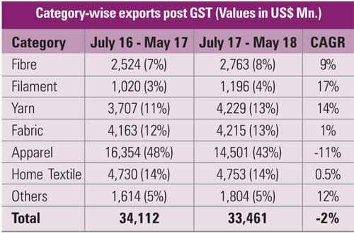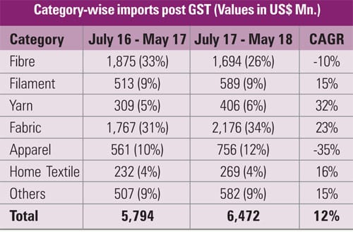 The Indian textiles and apparel sector continues to be bedevilled by one problem or another. The introduction of the Goods and Services Tax (GST) was supposed to bring in more relief to the industry. Far from it, one year of completion of GST has been a significant growth in imports of all value-added products – yarn, fabrics, garments and home textiles – and a steep fall in exports creating a big issue for the domestic industry with the customs duties coming down substantially. This has made imports cheaper by about 15-20 per cent Post- GST, countervailing duties (CVD) and Special Additional Duties (SAD) were withdrawn and Integrated GST. This has left textile manufacturers and exporters wanting for more.